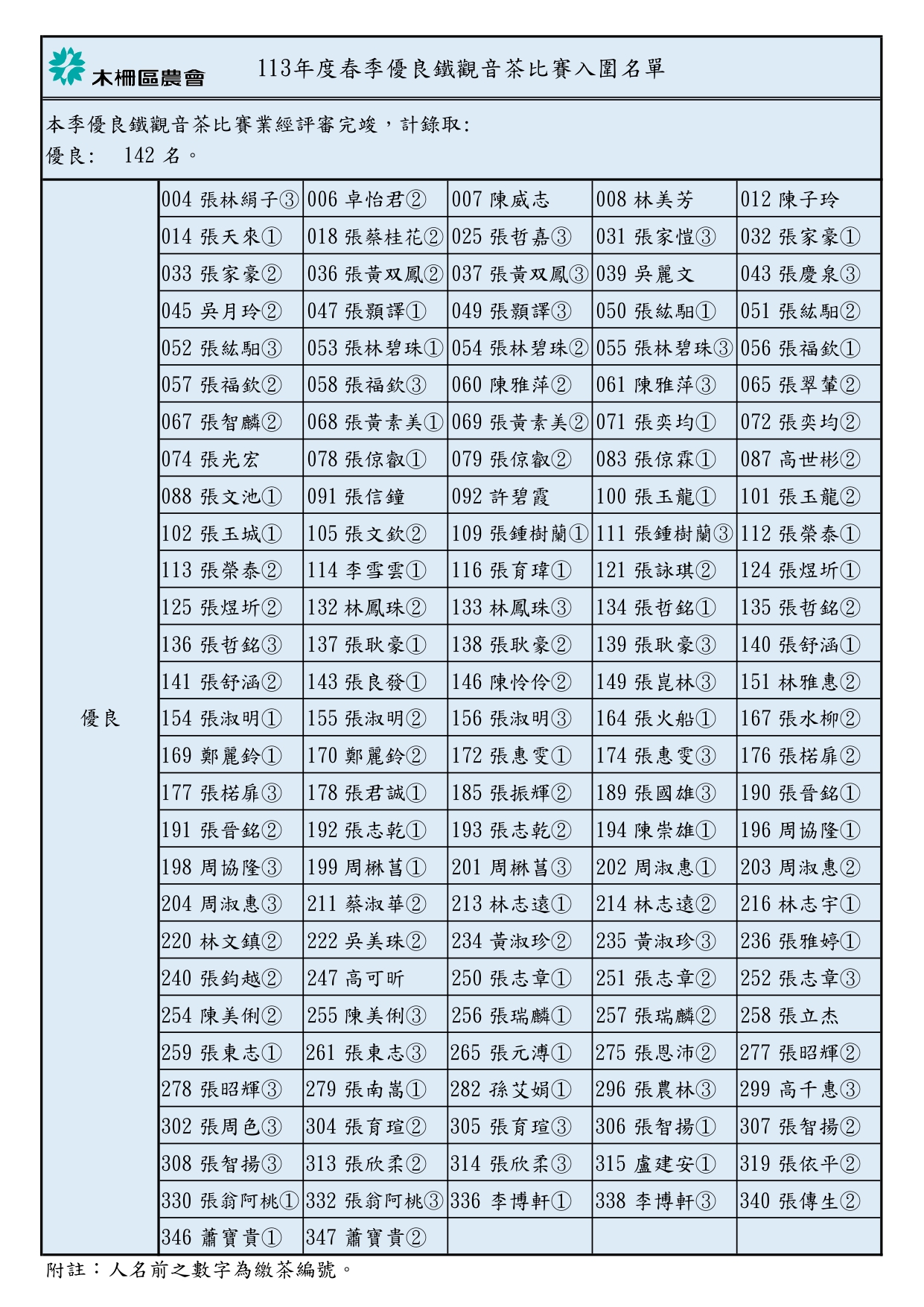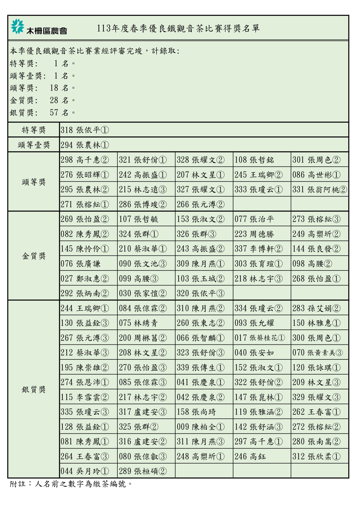 113年度春季優良鐵觀音茶比賽得獎名單如下: