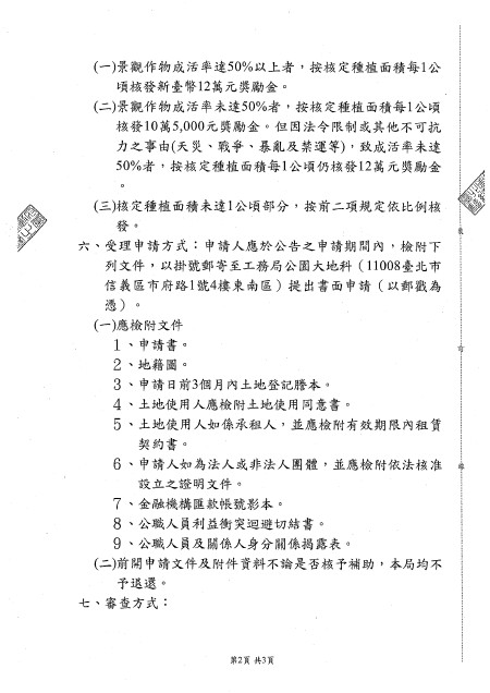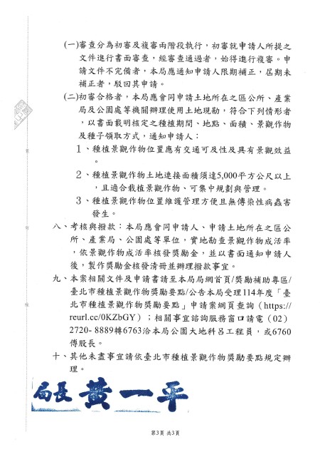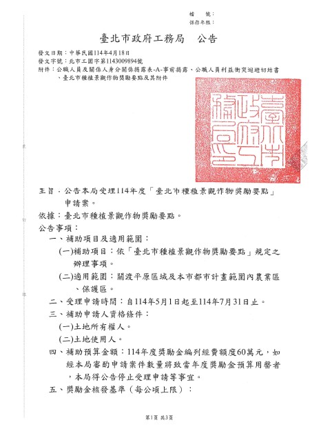 302025-04 臺北市政府工務局辦理「臺北市種植景觀作物獎勵要點」 受理申請期間自114年5月1日起至114年7月31日止。 公告如下: 本案獎勵要點網址連結(請按我) 回上一頁 本會信用部113年度四大報表(資產負債表、事業損益表、資本及公積撥補表及現金流量表) 農業部農糧署114年『推動農產品初級加工場管理制度計畫』-「加工技術及食品安全衛生教育訓練(農糧類)」招生簡章