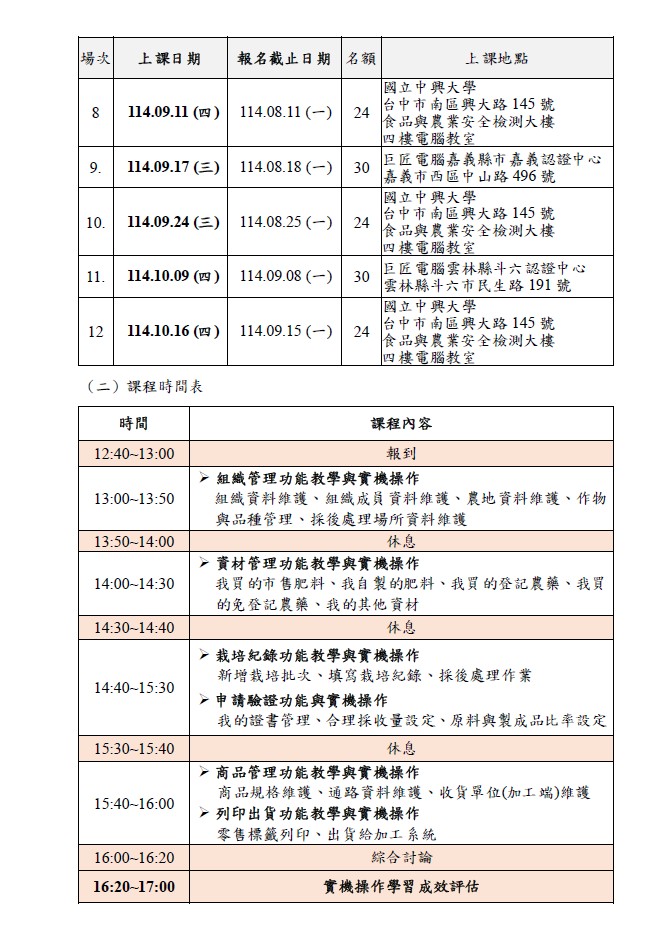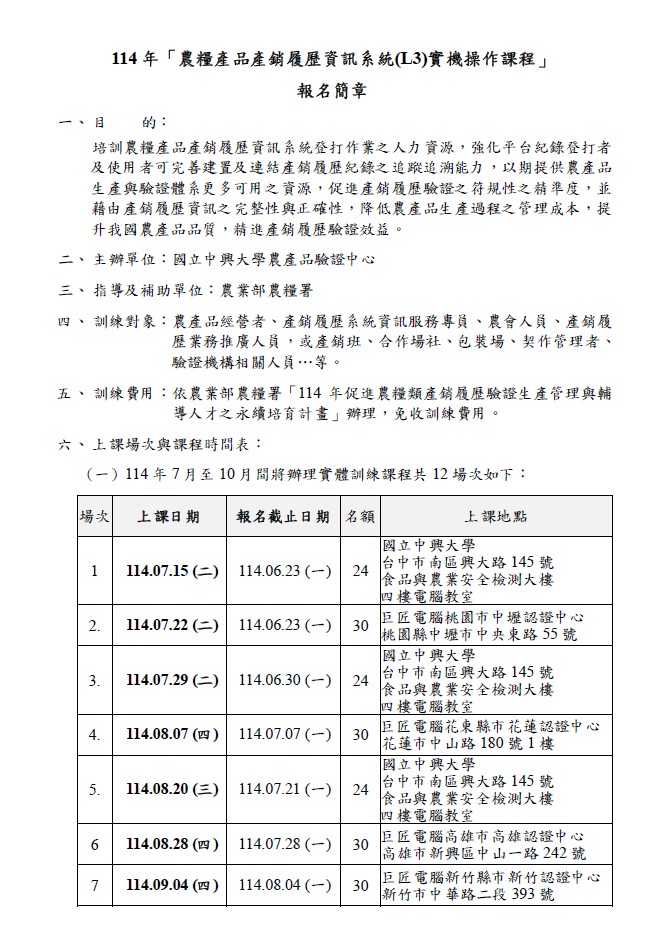 162025-06 國立中興大學農產品驗證中心辦理之114年【農糧產品產銷履歷資訊系統(L3)實機操作課程】課程 回上一頁 財團法人農業保險基金徵稿 自114年6月1 日起,本會農漁行動達人APP無卡提款功能全面上線,歡迎多加利用。
