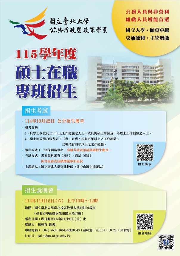 072025-10 國立臺北大學「公共行政暨政策學系碩士在職專班」115學年度招生訊息 回上一頁 協助宣導:遠離菸害,加熱菸一樣有害!! 敬啟:114年9月29日(星期一)因教師節補假1天,本會無辦公及營業。