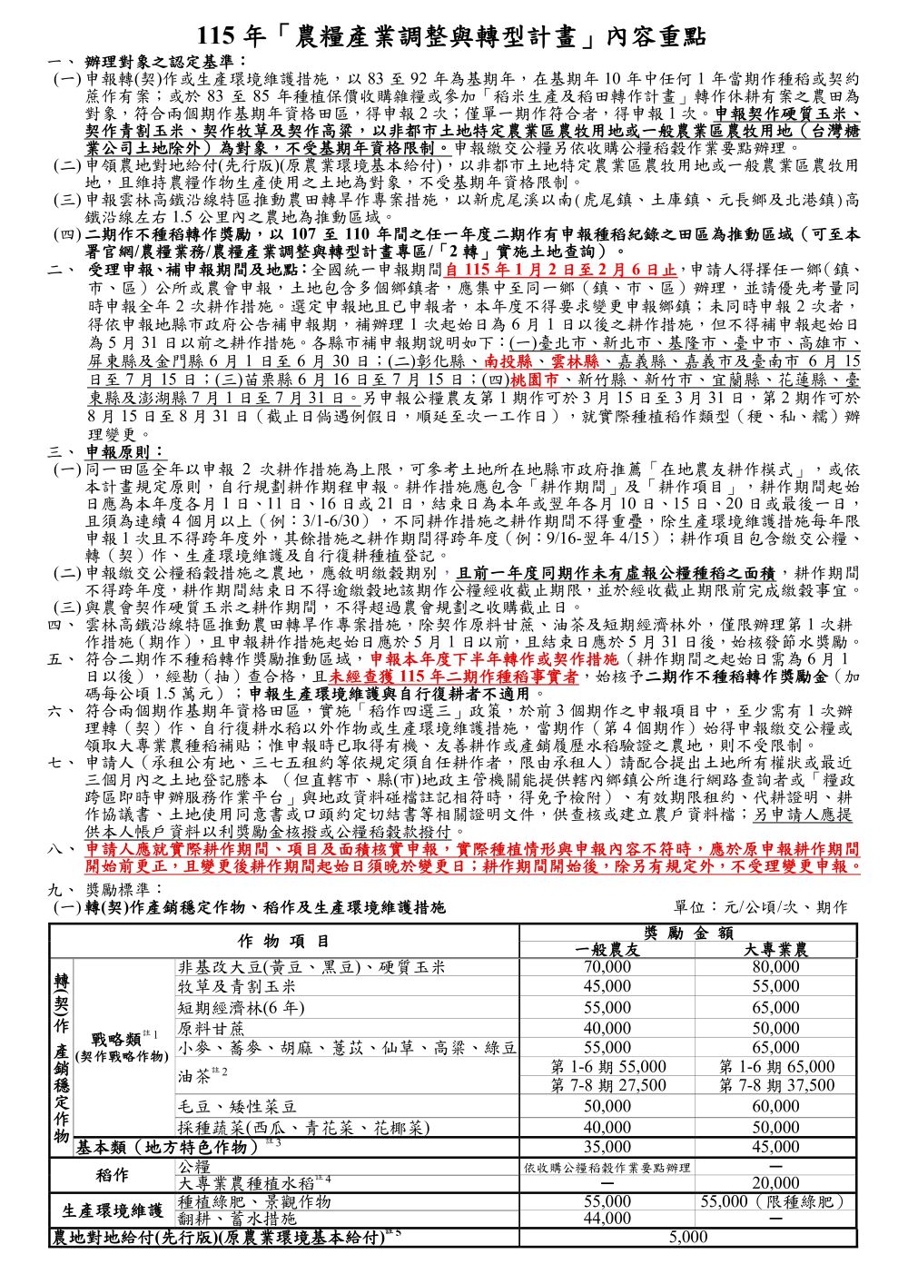 115年接續綠色環境給付計畫之「農糧產業調整與轉型計畫」
